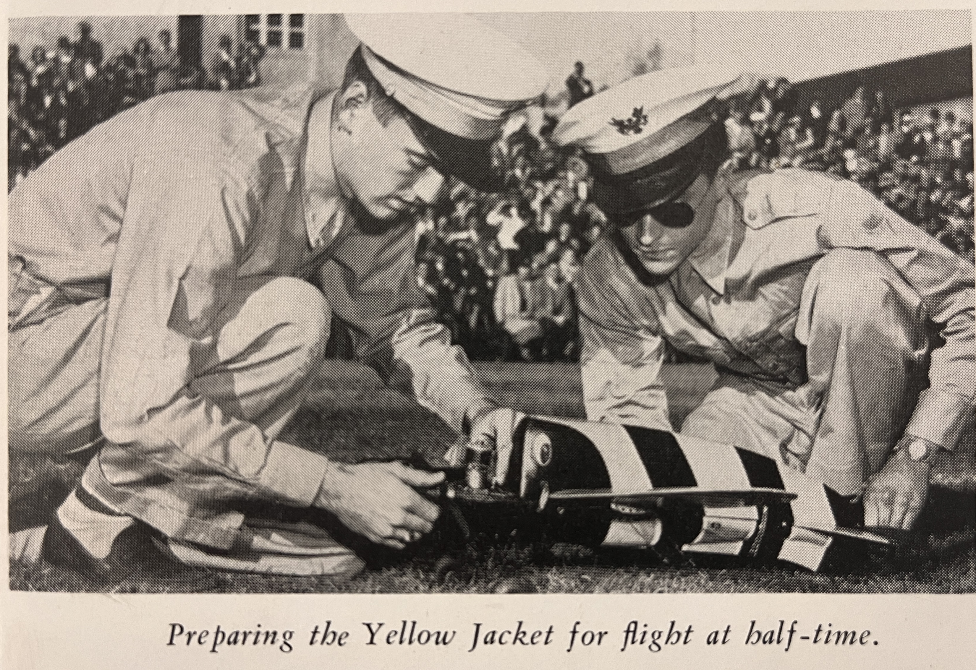 According to an account that the late Bob Barton, AE 56, one of the control-line pilots, wrote for the Living History Program, “it became superstition that if the Yellow Jacket didn’t fly, Tech would lose the football game. When something like this happened, you can imagine the elation of the opponent’s fans.”